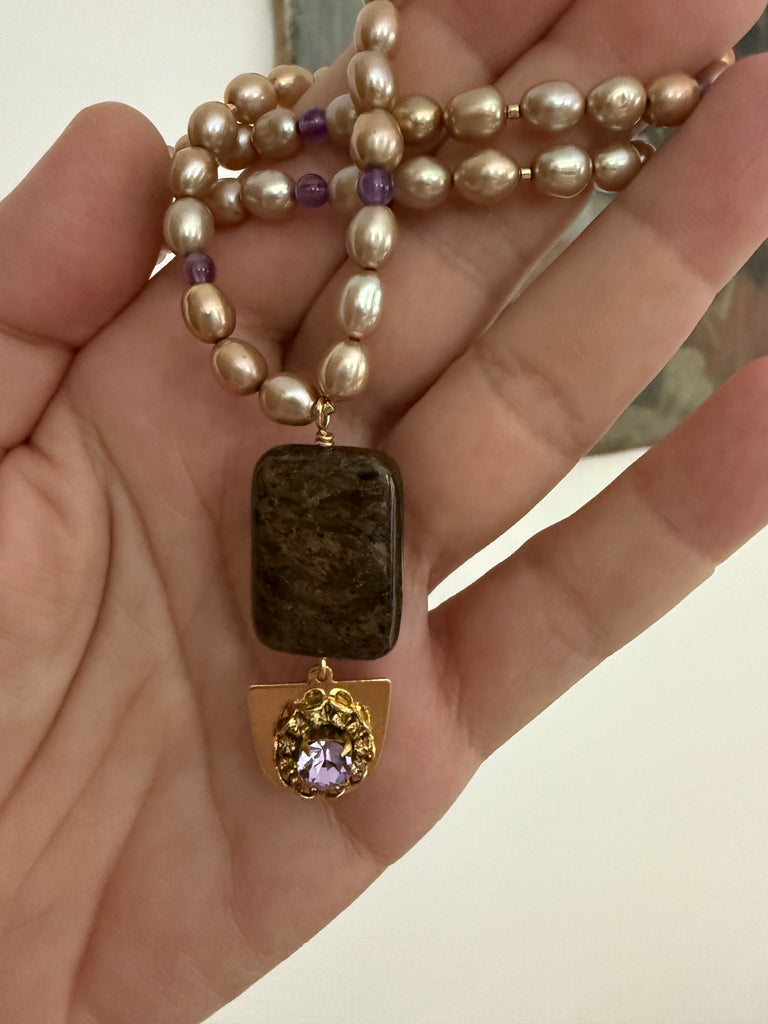 The Mara Necklace features soft gold-toned pearls paired with delicate amethyst highlights, complemented by a stunning Bronzite pendant and a subtle shimmering detail for added elegance.